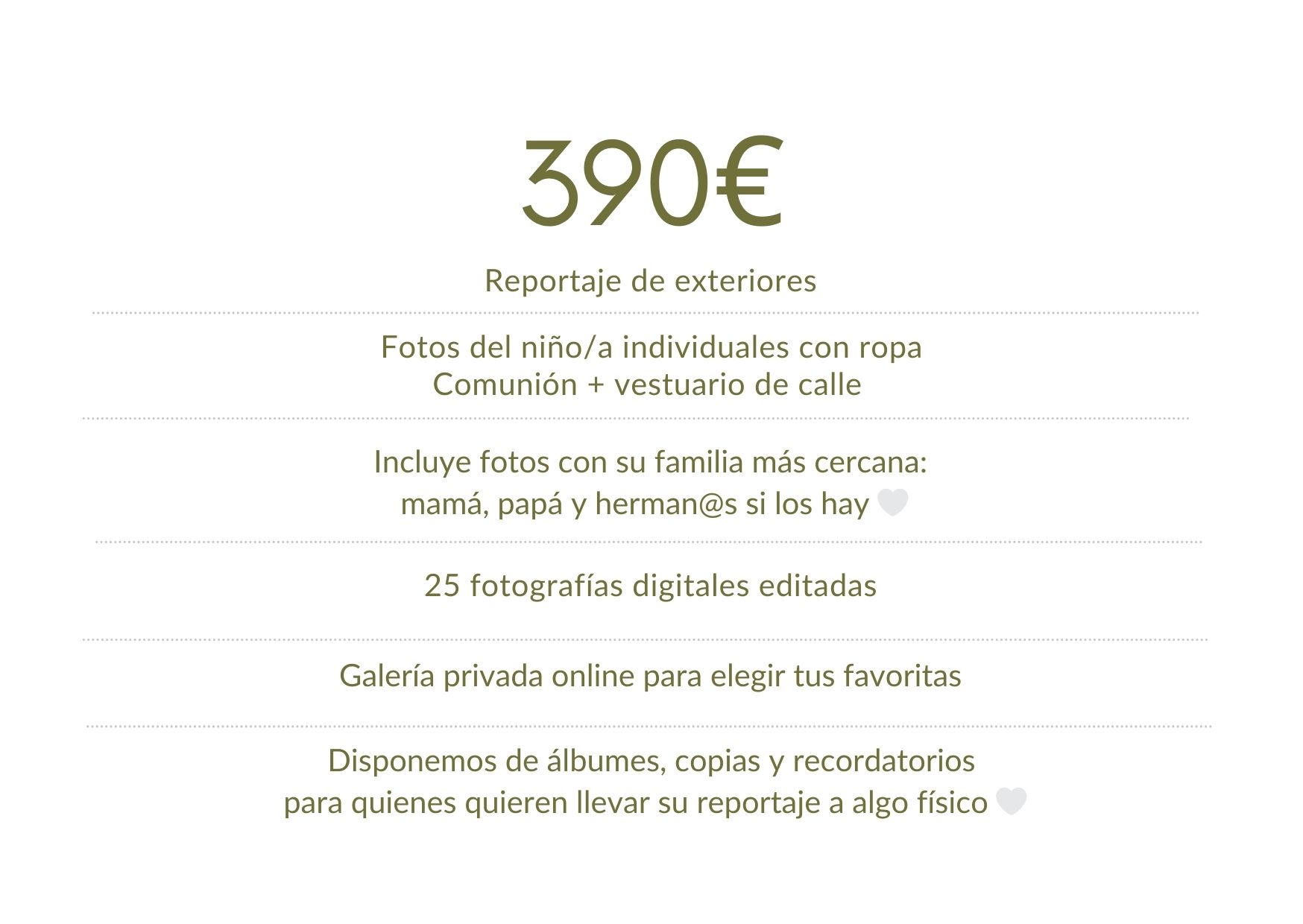 Trabajamos de forma sencilla y clara: una sesión cuidada, un número de fotografías suficiente para contar vuestra historia y la posibilidad de convertir vuestro reportaje en álbumes, copias o recordatorios si os apetece llevarlo a algo físico 🤍